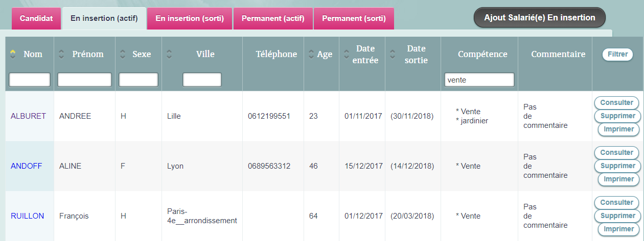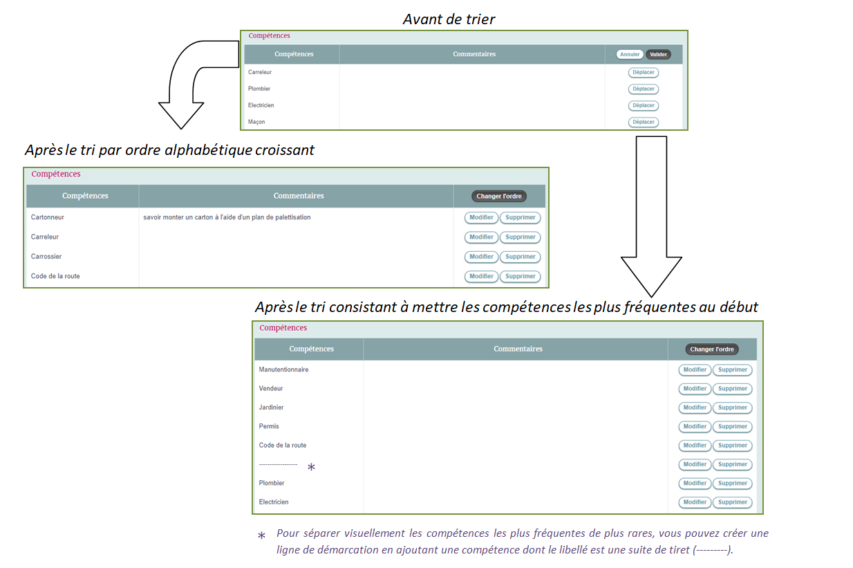 Les copies d’écran ci-dessous illustre deux exemples de possibilités de tri (par ordre alphabétique croissant ou les compétences les plus fréquentes au début).
