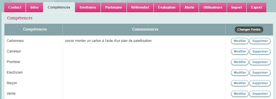 Par défaut, les compétences se classent dans l’ordre de votre saisie (l’une après l’autre). Pour faciliter l’utilisation des compétences, vous pouvez fixer un ordre qui vous est propre. Par exemple, vous pouvez ranger les compétences par ordre alphabétique croissant ou bien encore mettre au début les compétences les plus fréquemment possédés par les salariés en insertion et à la fin les compétences les plus rares.