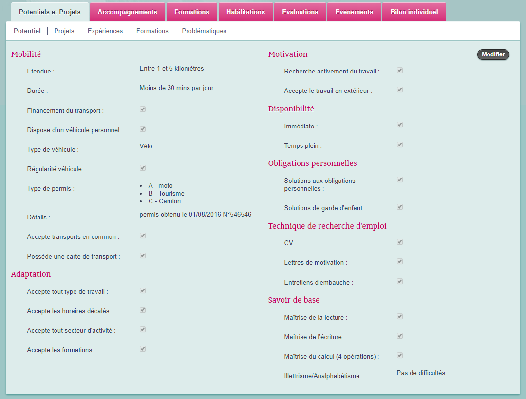 Mobilité : Ce bloc permet de mémoriser les moyens de déplacements du salarié en insertion. Exemple : type de véhicule possédé, type de permis de conduire, acceptation des transports en commun,…