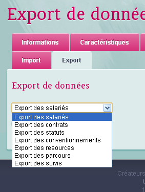 L'export vous permet de créer des fichiers CSV (lisible dans un tableur tel Excel ou Openoffice). Vous pouvez créer des fichiers exports pour :