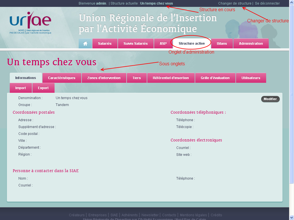 Avant d'utiliser l'application, le gérant doit procéder à quelques paramétrage. Pour cela il clique sur “Ma SIAE” (ou “SIAE Active” s'il est gérant de plusieurs structures au sein d'un groupe). Plusieurs sous onglets apparaissent alors lui permettant de gérer les informations générales de la structure choisie